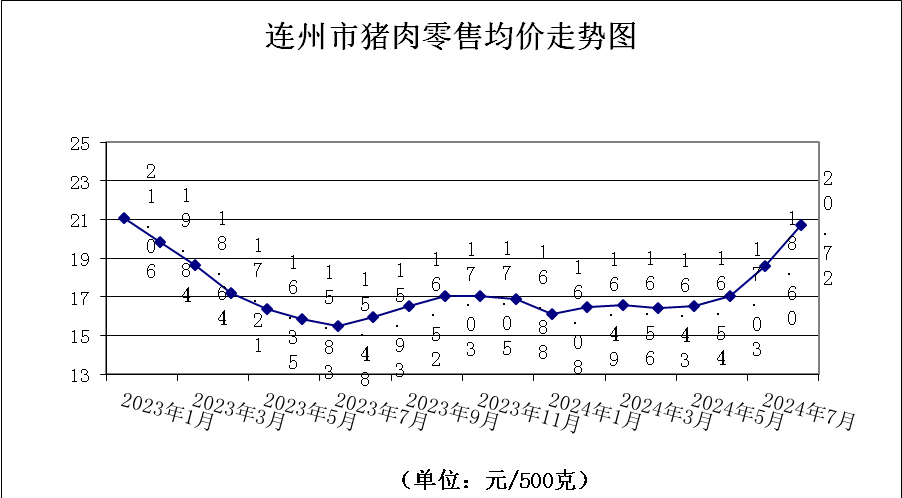 8月份,我市豬肉零售價(jià)格持續(xù)上升,漲幅擴(kuò)大。農(nóng)貿(mào)市場(chǎng)監(jiān)測(cè)的四種主要豬肉零售均價(jià)為20.72元/500克,環(huán)比升11.40%。其中,排骨28.69元/500克,環(huán)比升17.49%;精瘦肉21.08元/500克,環(huán)比升9.62%;肋條肉16.56元/500克,環(huán)比升8.02%,有皮上肉16.56元/500克,環(huán)比升7.25%。