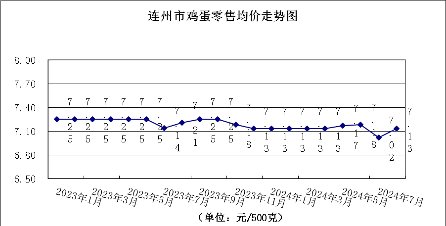 蛋類雞蛋平均零售價(jià)格為7.13元/500克,環(huán)比升1.57%。鴨蛋平均零售價(jià)格為8.63元/500克,環(huán)比不變。