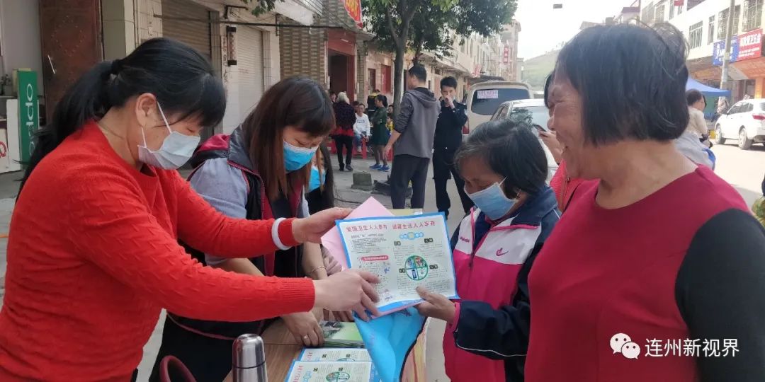 ▲工作人員向群眾發(fā)放愛(ài)國(guó)衛(wèi)生宣傳資料