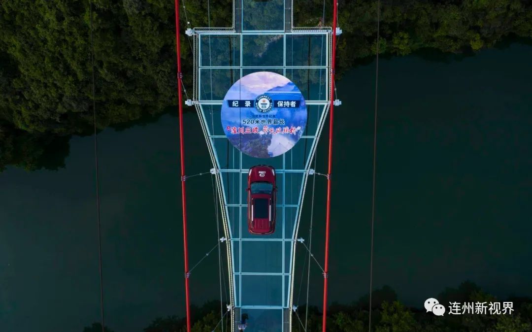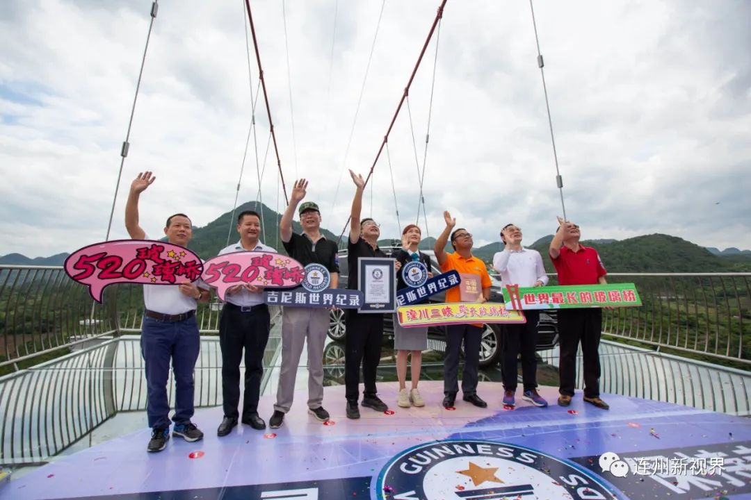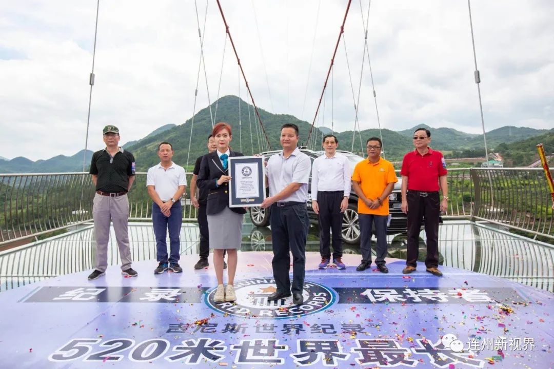 當(dāng)天上午,吉尼斯世界紀(jì)錄的認(rèn)證官侯穎在九陂鎮(zhèn)領(lǐng)導(dǎo)和廣汽集團、愛地旅游、擎天旅游有關(guān)負(fù)責(zé)人的陪同下,乘坐廣汽傳祺SUV,橫跨玻璃橋,成功抵達4號觀景臺,并在玻璃橋上宣布:擎天玻璃橋有效長度為526.14米,成功打破這項全新的吉尼斯世界紀(jì)錄稱號。