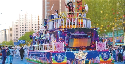 另一邊,劉師傅又將新乘客送到了城北區(qū)西海路的豹街。與大新街夜市等老牌夜市街區(qū)不同,豹街是西寧市近年來重點打造的新潮夜市街區(qū)。今年上半年,城北區(qū)圍繞“雪豹”主題IP,在豹街新增10處雪豹紅綠燈、63處雪豹元素噴繪地畫,還在3處樓梯設(shè)置投影,打造沉浸式光影秀。雪域精靈的相關(guān)元素,融進了豹街的街頭巷尾?;ㄜ囇灿位顒由?,雪豹人偶向路邊的游客揮手致意,花車側(cè)面繪有察爾汗鹽湖的全景圖,更有蒙古族“好漢三藝”、現(xiàn)代舞《西寧北》等節(jié)目熱鬧上演。