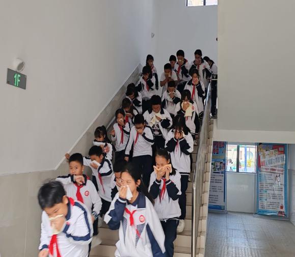 首先各班主任采用“示范+模擬+問答”三步教學(xué)法開展前置宣教:現(xiàn)場演示“沾濕毛巾對折三層捂口鼻、身體前傾60°躬身、步幅不超30厘米快步走”的標(biāo)準(zhǔn)動(dòng)作;組織學(xué)生在教室開展預(yù)演,逐人糾正“捂鼻不嚴(yán)、躬身角度不足”等問題;通過“火災(zāi)時(shí)能否坐電梯”“濃煙中如何判斷安全出口”等互動(dòng)問答鞏固常識,讓安全規(guī)范從“知曉”轉(zhuǎn)化為“熟練掌握”。