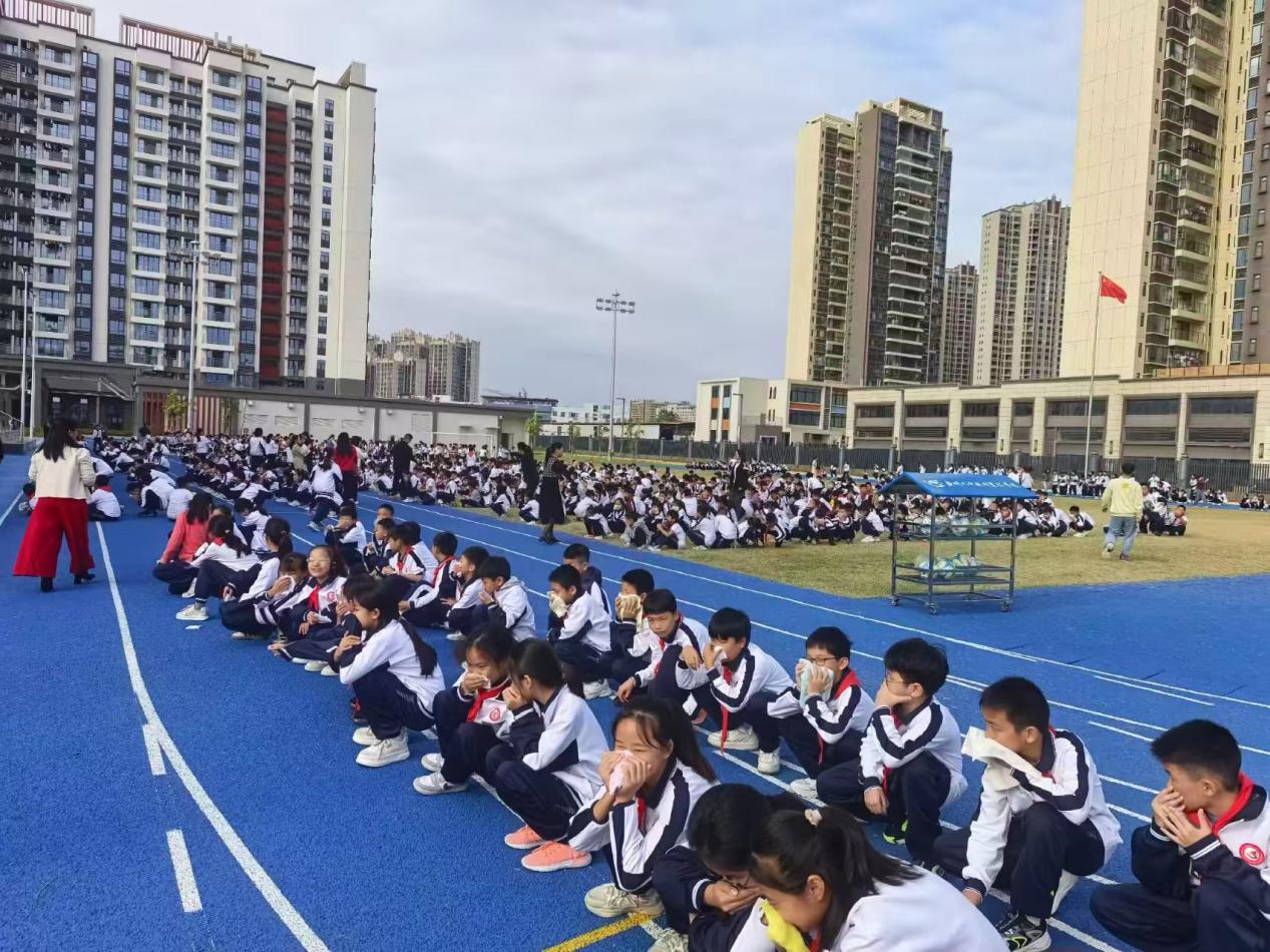 15時(shí)37分,全校師生順利抵達(dá)運(yùn)動(dòng)場指定區(qū)域。各班班主任立即組織學(xué)生蹲地待命,保持捂鼻姿勢防止“吸入濃煙”的模擬場景,隨后以“報(bào)數(shù)+點(diǎn)名”雙重方式核驗(yàn)人數(shù)?!耙荒昙墝?shí)到42人,全員到齊!”“三年級實(shí)到45人,無遺漏!”一聲聲清晰的報(bào)告,在運(yùn)動(dòng)場上依次傳遞,標(biāo)志著本次疏散演練圓滿完成,全程耗時(shí)僅2分05秒。